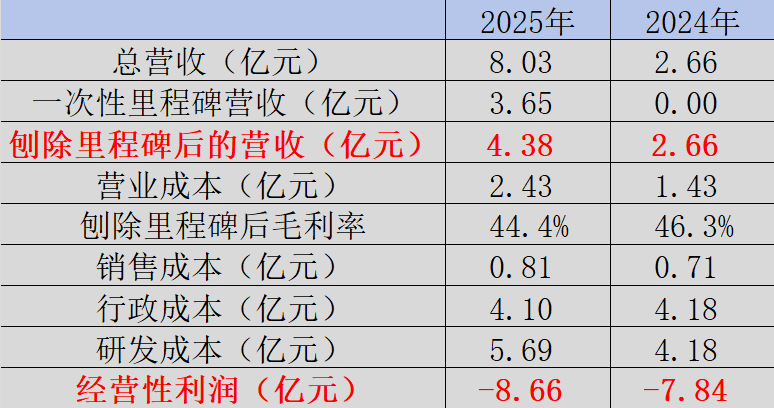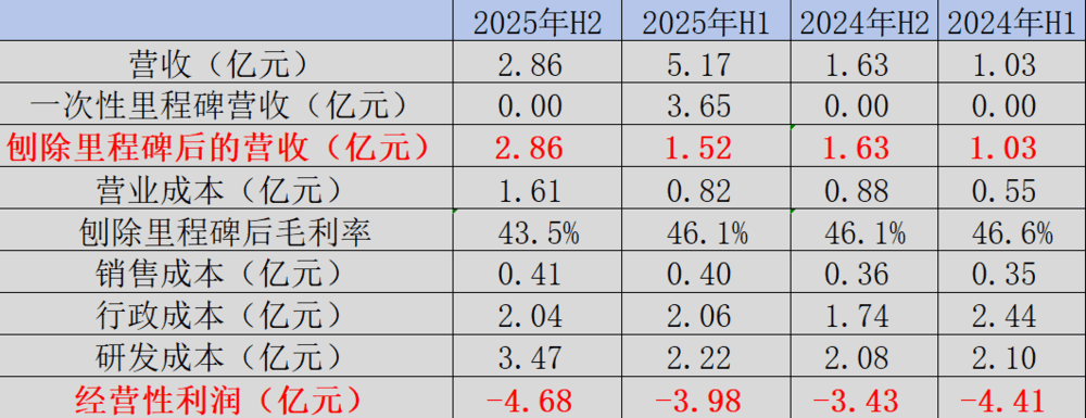 首先看剔除一次性里程碑款项后的经营性收入:从2024年上半年的1.03亿元,稳步提升到2025年下半年的2.86亿元。虽然当前营收规模还不足以覆盖高额的研发投入,但增长趋势明确,业务正处于快速放量阶段。同时,公司在销售成本与行政开支上控制得当,没有出现大幅攀升,体现出经营效率在持续提升。