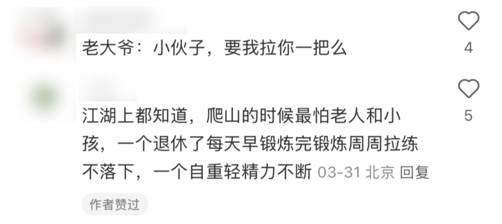 拍视频的同伴感叹:“咱俩身体不如大爷,20多岁让70多岁的背”。路人调侃“你咋骑老头下山?”,背上的小伙挣扎说“自己走也行”,却被大爷拒绝:“你腿瘸着咋下去!”