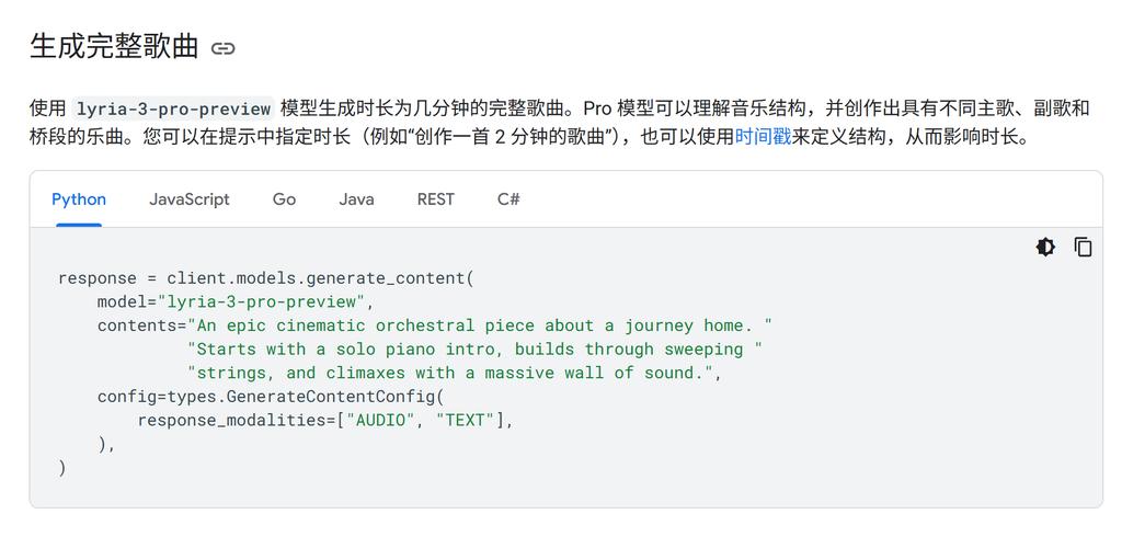 同时,面向开发者的Google AI Studio和Gemini API也同步上线了Lyria 3 Pro,与之前的Lyria RealTime(实时音乐生成能力)一同提供,开发者可将这些能力集成到自己的应用中。