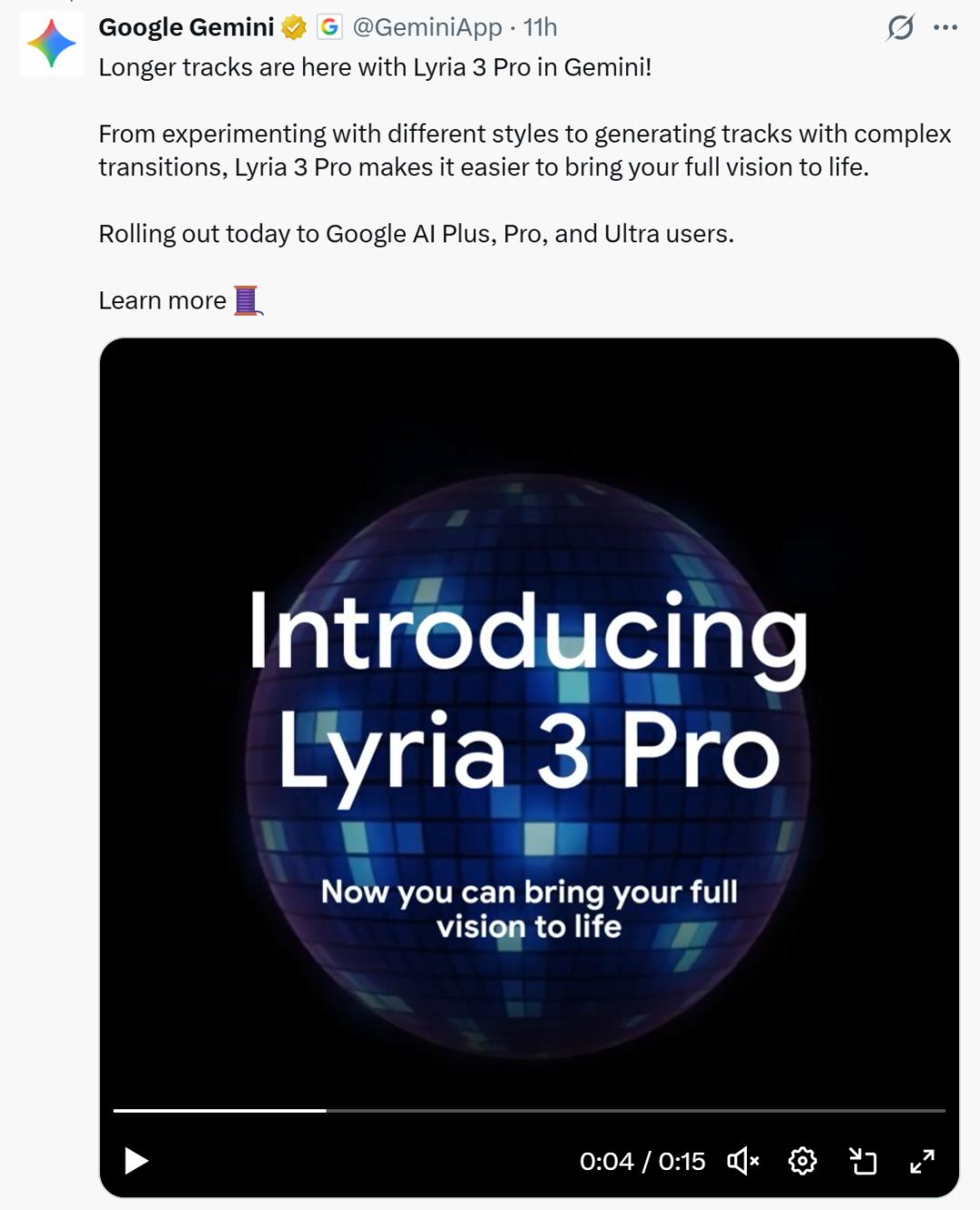 智东西3月26日消息,当地时间3月25日,谷歌发布了由DeepMind团队打造的AI音乐生成模型Lyria 3 Pro。作为上月发布的Lyria 3的升级版本,它最大的亮点是音乐时长从30秒大幅提升到3分钟,并且能理解歌曲结构,用户可通过提示词指定前奏、主歌、副歌、桥段等段落,实现对完整歌曲的精细控制。