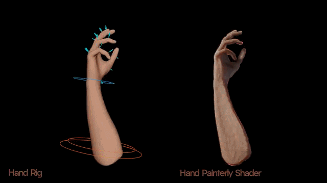 为了完美复刻手绘油画的质感,Apolline Royer在Blender中为每个主要物体精心烘焙了三套不同版本的贴图(包含漫反射、粗糙度和法线贴图),并通过循环播放这些纹理来打破计算机生成的重复感,营造出丰富的手工绘画变化。此外,她还定制了一款专属的轮廓线着色器,为画面勾勒出类似素描手稿的线条感,这一细节在手部那条细腻的粉红轮廓线上体现得尤为鲜活,仿佛画笔刚在纸面划过。