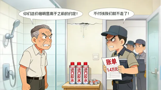 2022年3月,陈老伯因家中卫生间漏水,通过网络联系了一家维修公司。施工前,维修队告知需用7至10斤“正规进口胶水”,单价198元/斤,陈老伯觉得总价合理便同意施工。可维修结束后,领队轩某却开出1.4万元的高额账单。陈老伯认为费用远超约定和市场价,当场表示不满并拒绝付款。轩某随即大力拍桌威胁:“今天不付钱你别想出门!”“这钱你必须付!”另外两名维修人员则堵在门口,不让陈老伯离开。