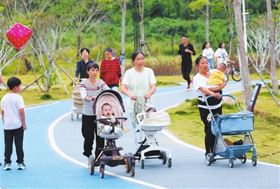市民在海螺馨苑公园的休闲步道上陪伴孩子玩耍。李学仕 摄