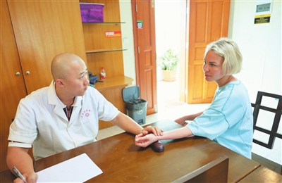 在三亚市中医院(三亚国际友好中医疗养院),医生为国外游客把脉问诊。