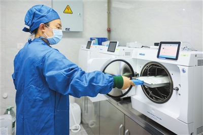 在北京大学口腔医院三亚医院迎宾门诊部,工作人员使用进口的高压灭菌器为医疗器械消毒。