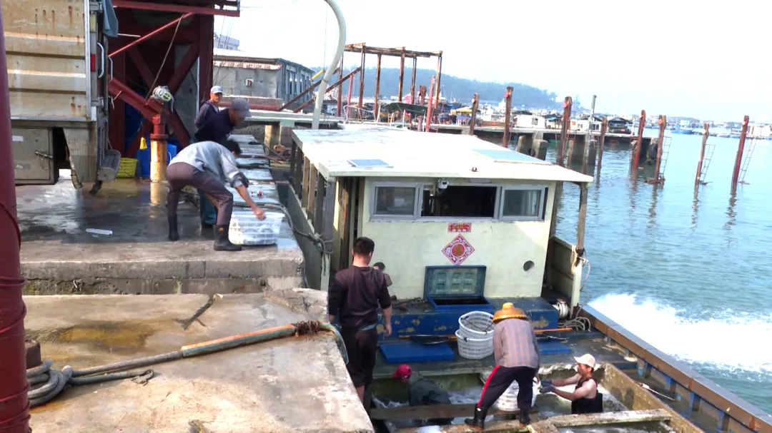 3月26日上午8点多,记者来到闸坡旧澳湾码头,看到码头边停着几艘小渔船,养殖户们分工合作,把渔排上的成品鱼转运到岸上、装车运输,整个码头热闹非凡,交易繁忙。