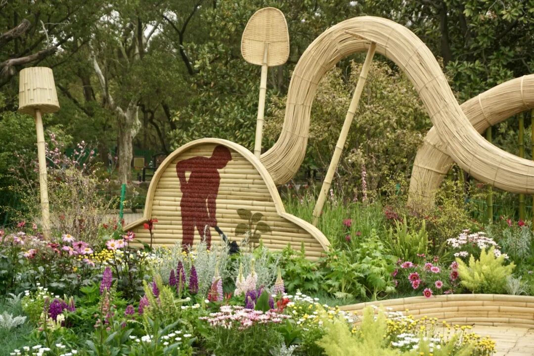 “主题花艺”展区围绕开园四十周年与自然童趣主题展开:西侧再现共青从滩涂拓荒到城市绿肺的四十年奋斗历程,致敬几代人的开拓精神;东侧打造童趣花园,构建自然童真的亲子互动空间。