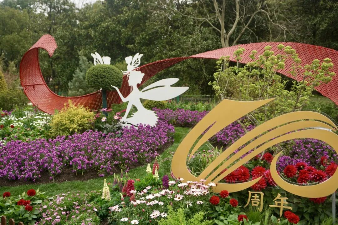 “七彩森林”展区设有五个景观节点:西门入口的“森林花境”以粉色花卉为主调;“繁花跃马”以“三马精神”为核心,借助雪松花坛展现公园四十年来继往开来、昂扬奋进的精神风貌;“屿境繁花”以“屿”为核心、“花”为媒介、“蝶”为灵韵,营造出闹中取静的林下花屿秘境。