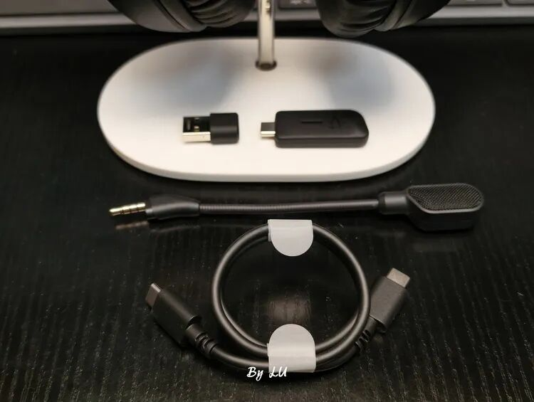 HyperX飓风3加强版包装内有耳机本体、可拆卸麦克风、USB-C接收器、USB-C转USB-A转接头、充电线,配套齐全,如下所示: