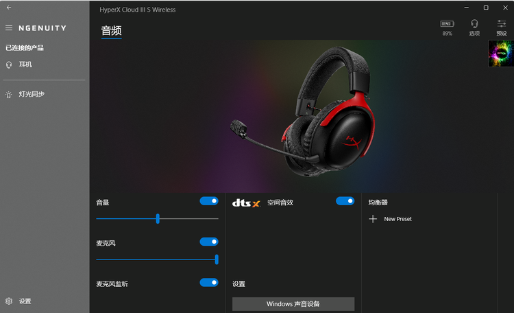 接上2.4GHz接收器,打开HyperX NGENUITY软件,可调EQ、开DTS Headphone:X空间音频。DTS空间音效在看电影和玩3A大作时能让声场开阔,沉浸感明显提升。