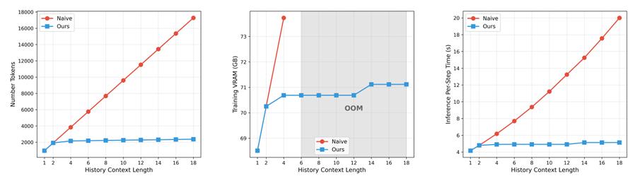 这个简单思路让Helios在回顾久远历史画面时,token消耗仍保持在极低的恒定水平,历史信息的显存占用直接压缩至原先的八分之一,彻底解决了单卡运行“爆显存”的难题。