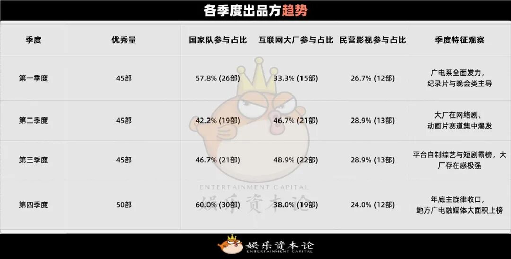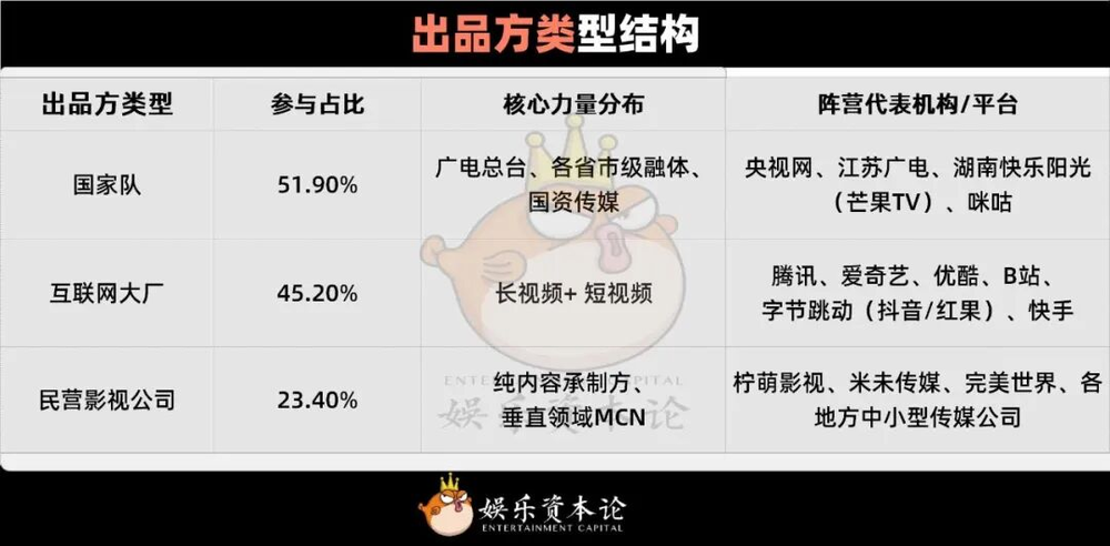 优质内容离不开优质制作主体。分析397部作品背后的出品方结构,呈现出“国企+大厂+民营”协同发展的格局。