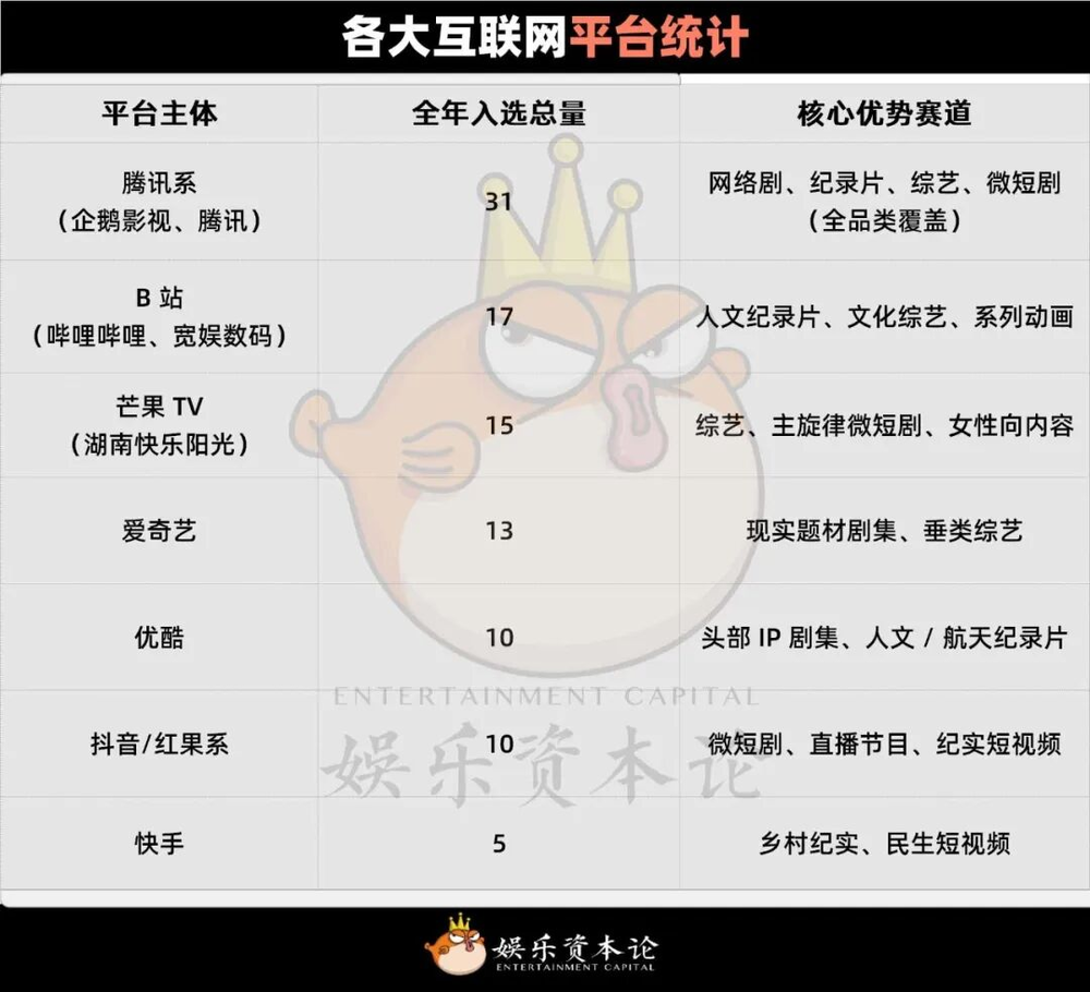 长视频平台(爱优腾)仍是高品质剧集和大型综艺的主要生产者,持续输出兼具商业价值与社会意义的头部IP。其中腾讯系(企鹅影视、腾讯)全年入选31部,覆盖网络剧、纪录片、综艺、微短剧等多个品类,展现出强大的综合实力。