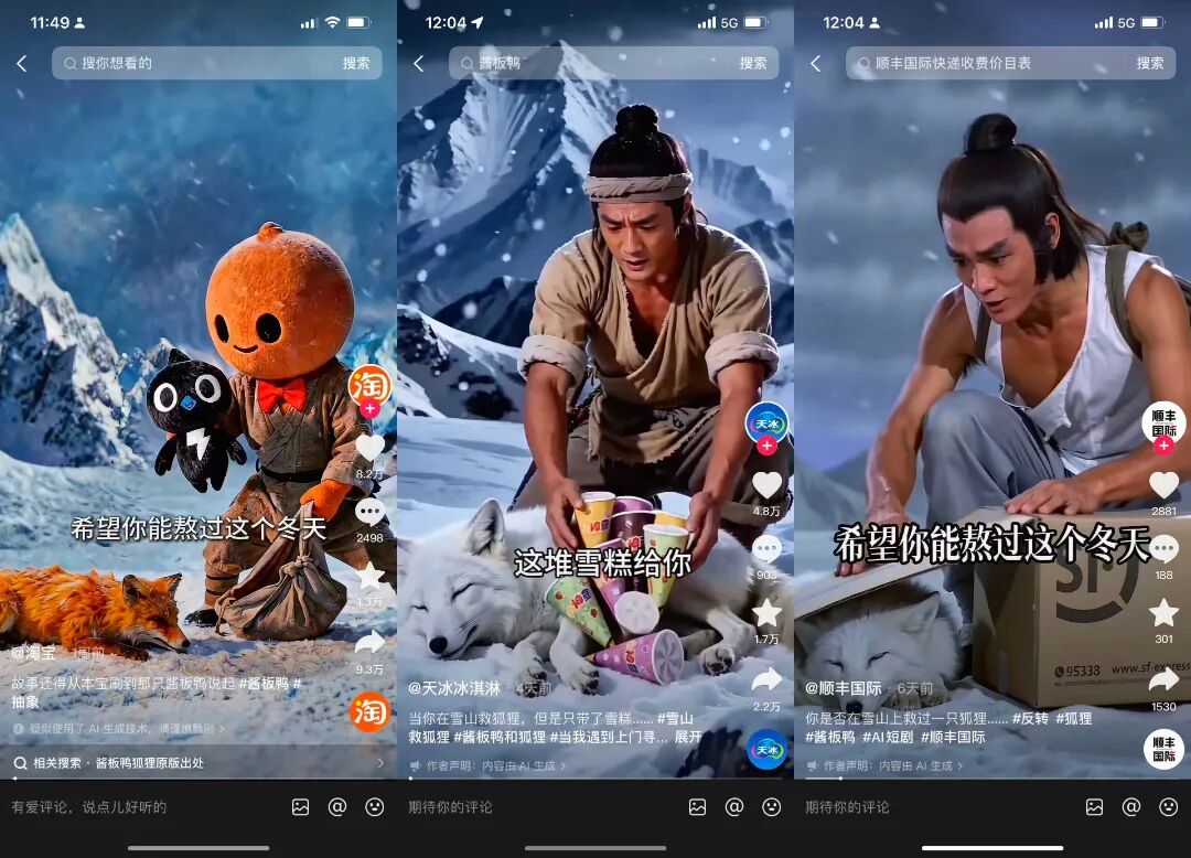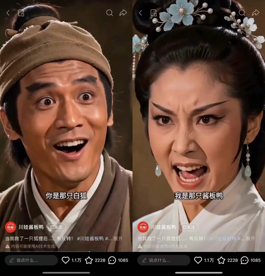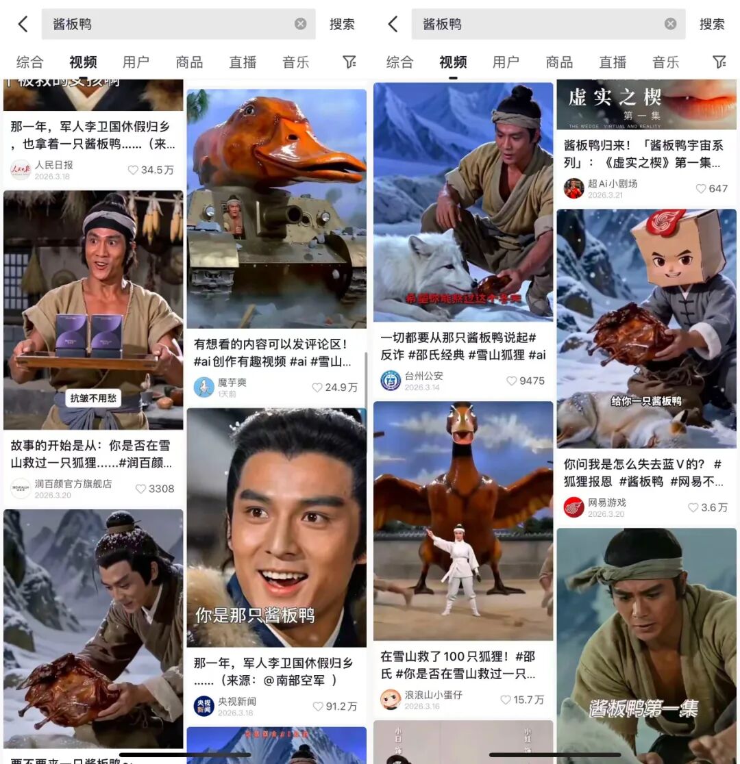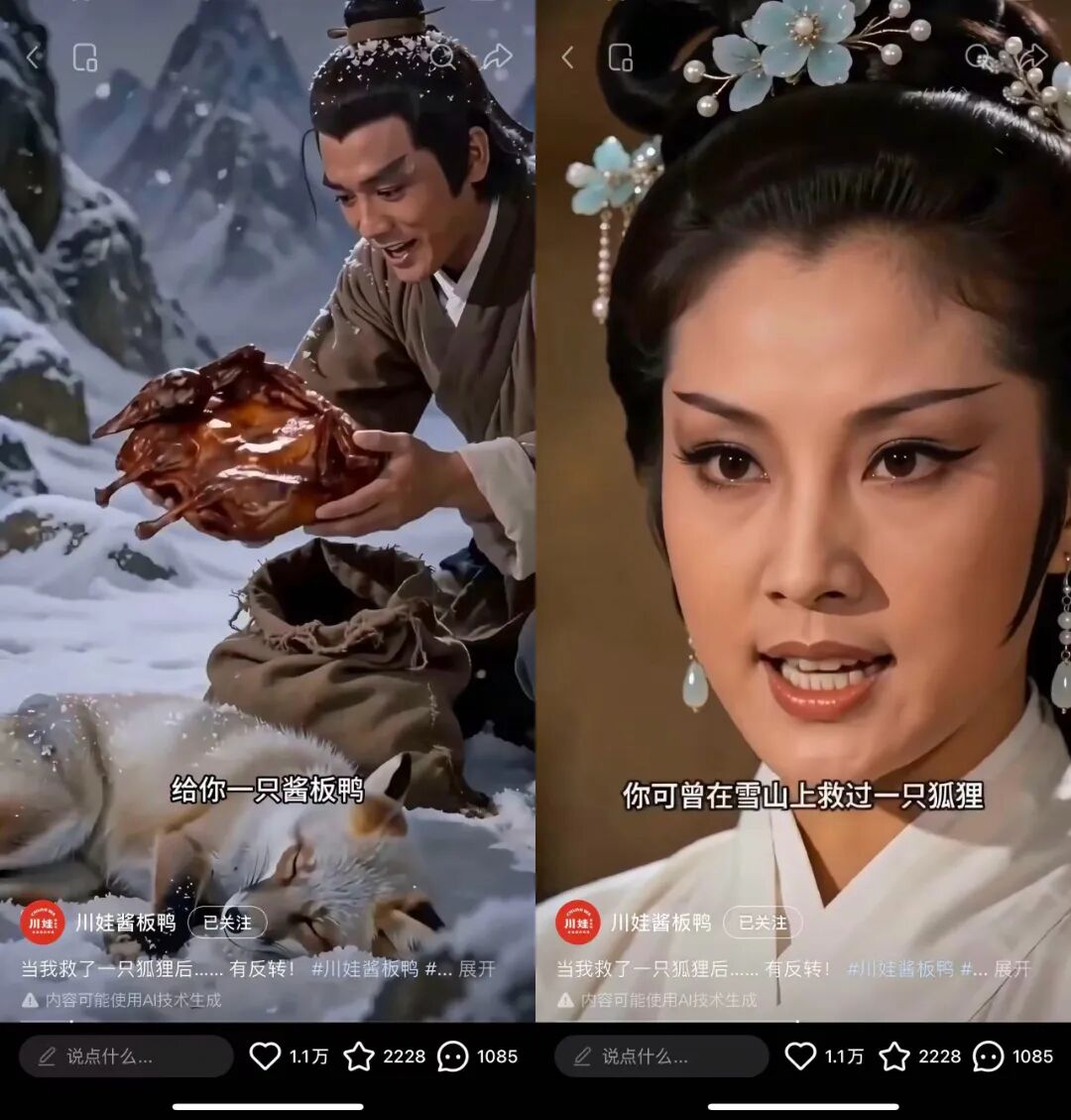 这条短视频以60年代邵氏武侠电影场景为基础进行改编,核心是将“雪山救狐报恩”的传统剧情反转,不是“狐狸报恩”,而是“酱板鸭复仇”。