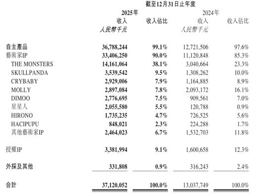 LABUBU贡献了141.6亿元收入,仍是最亮眼的IP,但另一个不容忽视的变化是,艺术家IP收入占比提升至90%,授权IP收入同比增长111.3%。