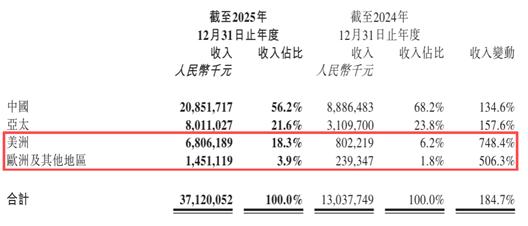 2025年,国内营收208.5亿元,同比增长134.6%,占比下降至56.2%。表面上看是占比下滑,实际上是被增长更快的海外业务“稀释”了权重。