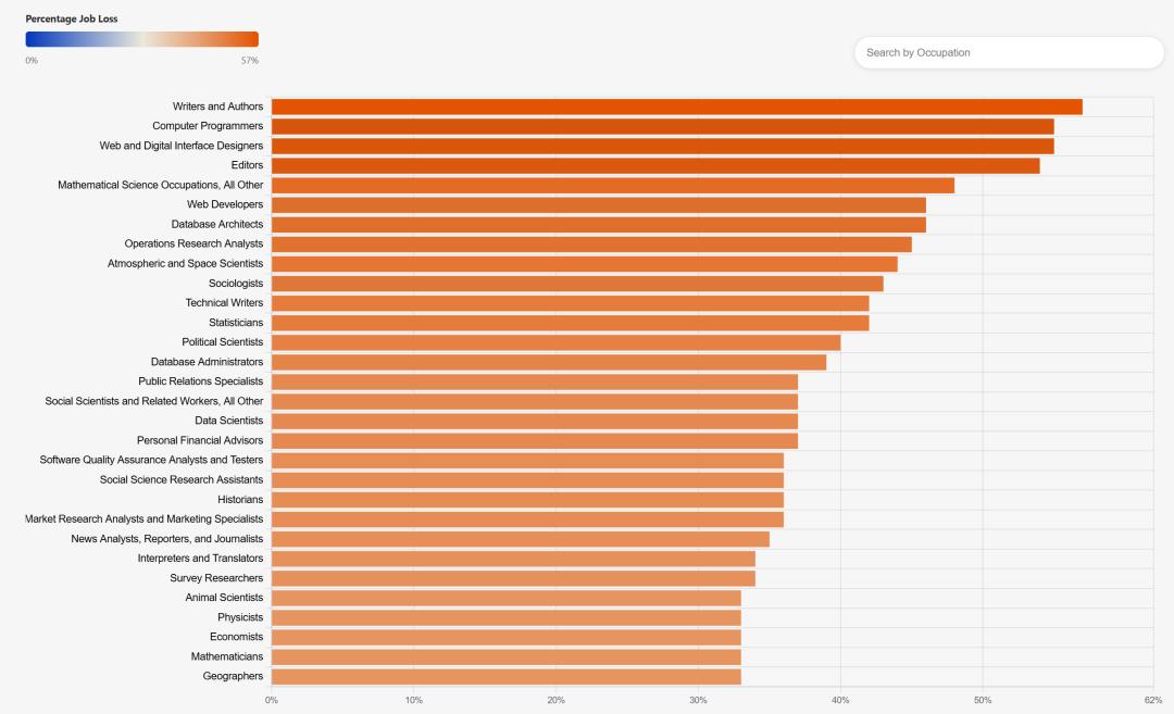 具体到职业,作家的岗位替代率高达57%,程序员和网页设计师均达55%。