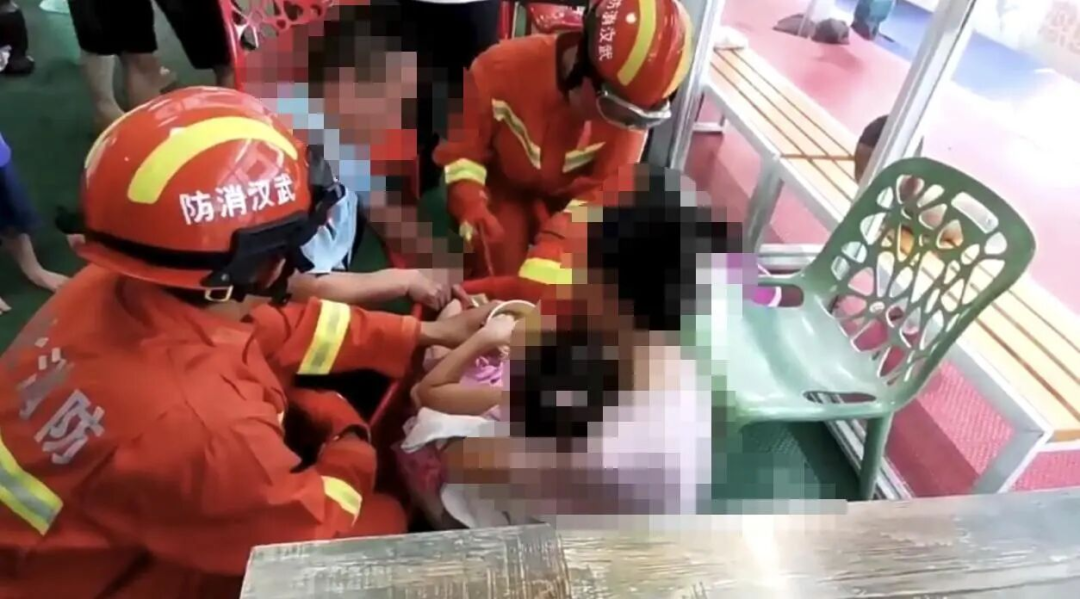 2025年8月,湖北武汉某度假区内,一名约6岁女童玩耍时左腿膝盖到小腿被卡在6厘米宽的塑料凳缝隙里。消防员固定塑料凳后做好防护,用小号钢锯精准切割凳面,帮助女童成功脱困。