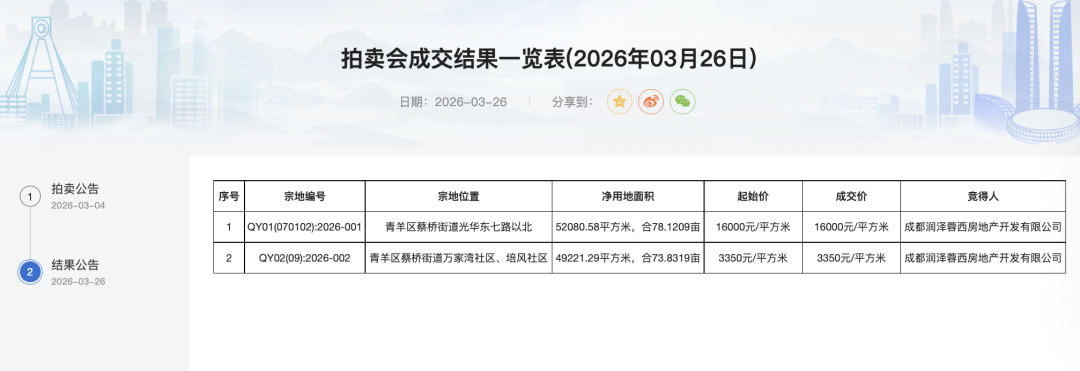 3月26日,成都市公共资源交易服务中心公布青羊区蔡桥街道两宗商住组合地块的拍卖结果,净用地面积约12.1万平方米,其中商业用地约4.9万平方米,由华润置地子公司成都润泽蓉西房地产开发有限公司以24.79亿元竞得。