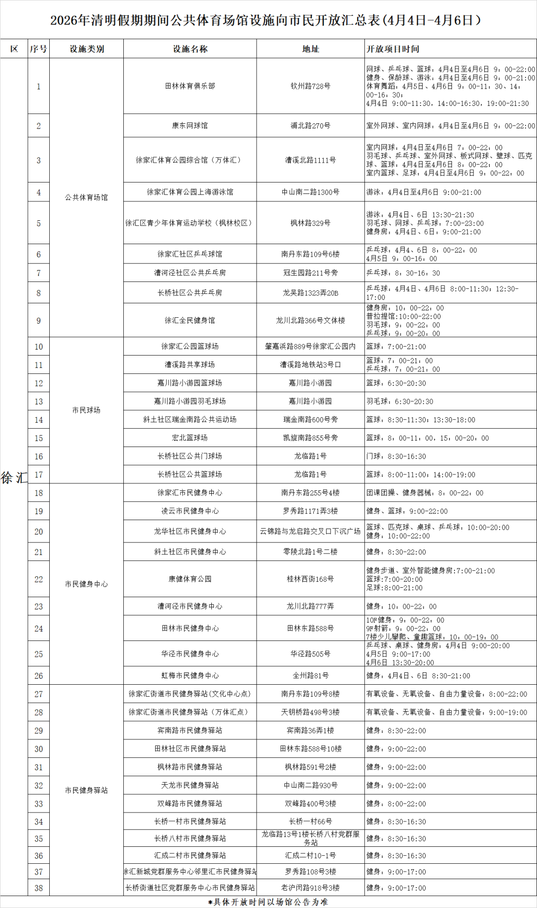 原标题:《春暖花开动起来!清明假期,徐汇38处体育场馆对外开放》