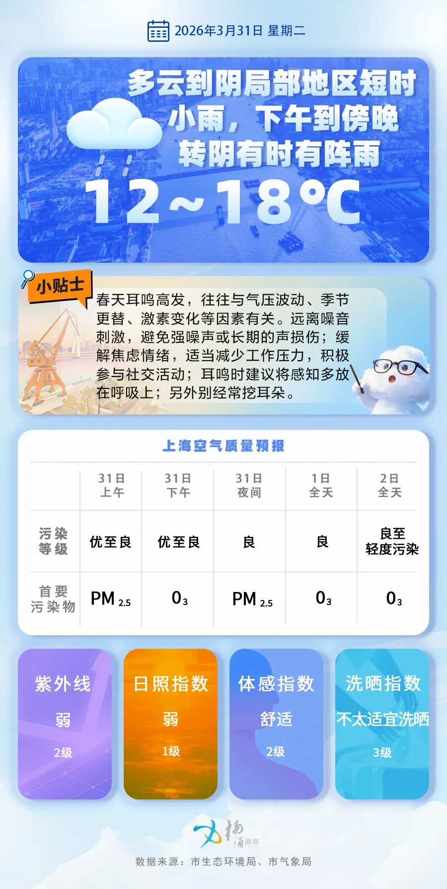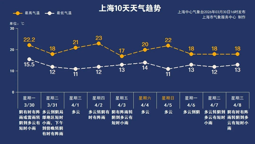 周三到周四白天,上海以多云天气为主,在阳光的助力下,周四最高气温将攀升至23℃。受西南暖湿气流影响,周四夜间到周五,上海还会迎来一次较为明显的降水过程。周六和周日天气转晴,最高气温又将回升至20℃以上。