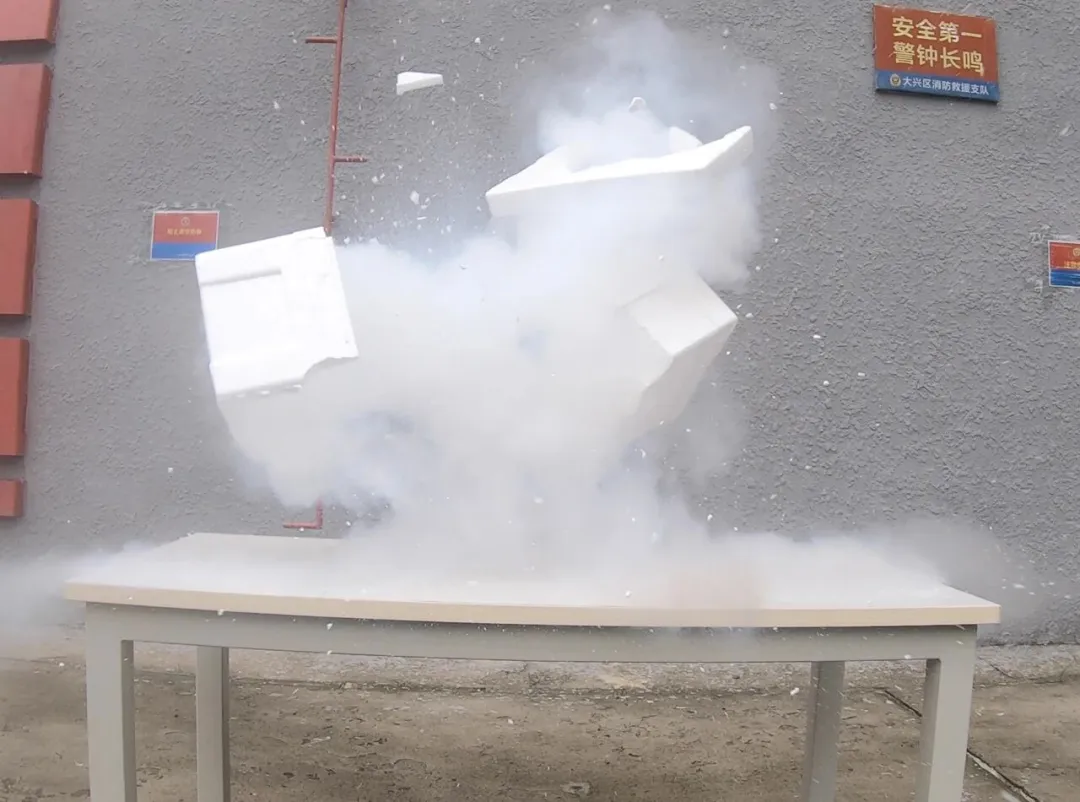 消防员介绍,干冰常用于制冷保鲜,但不当使用有安全隐患。他们通过试验验证威力:将干冰放入矿泉水瓶加水,瓶内“沸腾”,拧紧瓶盖约30秒后爆炸,瓶盖被顶飞。