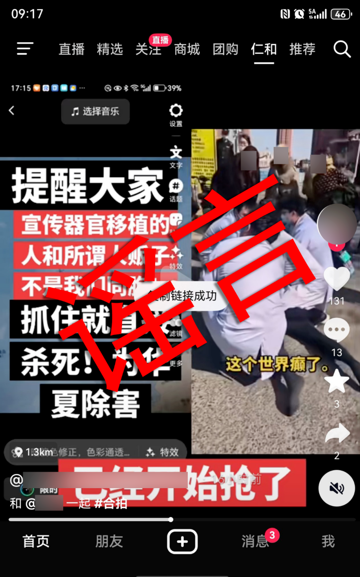 3月16日,网民纪某在抖音平台发布一张医务人员抢救病人的照片,并配文称“已经开始抢器官了”,该内容引发不良社会反响。