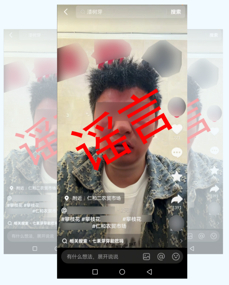 3月11日,网民赵某为提升个人账号流量,在抖音平台发布了一段经特效处理、显示自己脸部浮肿的视频。视频中,赵某声称自己在攀枝花仁和农贸市场购买到被“漆芽”冒充的“椿芽”,食用后出现严重过敏反应。