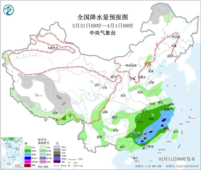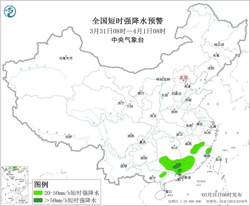 中央气象台3月31日06时继续发布暴雨蓝色预警: