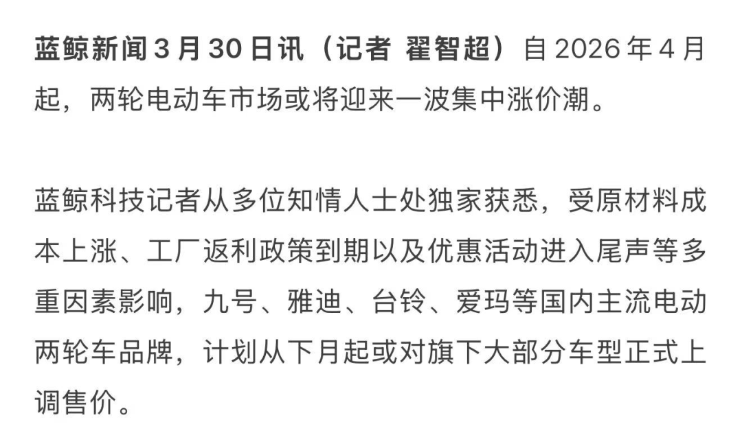 “这次涨价不是我们门店自己决定的,是品牌总部统一通知的。”钟泽坦言,首先是原材料成本上涨,电池、钢材、橡胶等核心零部件价格持续走高,其中电池成本在整车成本中占比较高,直接推动了生产成本的增加。其次,新国标安全政策升级后,车辆需要加装更多安全配置,进一步提高了生产投入。另外,一季度的厂商返利政策到期,这几方面因素叠加,总部才决定4月份涨价。