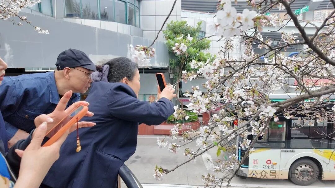 公交43路车队的工作人员介绍,每年樱花的花期都是市民最关心的事,所以车队每天都会关注樱花的生长。昨天枝头还都是小花苞,没想到一夜之间,超过一半的花苞都开放了,粉白的花瓣缀满枝头,给忙碌的公交车站增添了浪漫的春日色彩。为了让市民有更好的赏樱体验,车队工作人员一边维持秩序,一边布置现场。巴士二公司南浦车队线路安管员葛岭枫说:“今年樱花节,我们会设置一些打卡标志,供市民打卡。我们也会安排志愿者帮助市民拍照,希望给大家留下美好的印象。”接下来,车队还会提供专用的拍照打卡背景,让市民在赏樱的同时,有更丰富的体验,让每一个路过或停留的人都能感受到春天的温暖和美好。