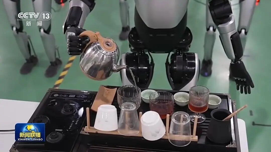 总台央视记者王世玉介绍:“这些机器人正在进行出厂前的最后测试,这台机器人正在练习泡茶。可以看到它能精准定位茶杯位置,注入的茶水量也恰到好处。”