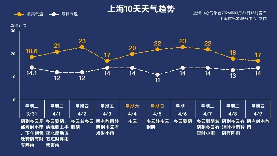 周四气温继续上升,最高可达23℃。周五将有一场较明显的降雨,受阴雨影响,最高气温回落至17℃。周六至下周一,本市以多云天气为主,最高气温又将接近23℃。春季天气系统活跃,晴雨转换迅速,建议及时关注最新天气信息,合理安排生活与出行。