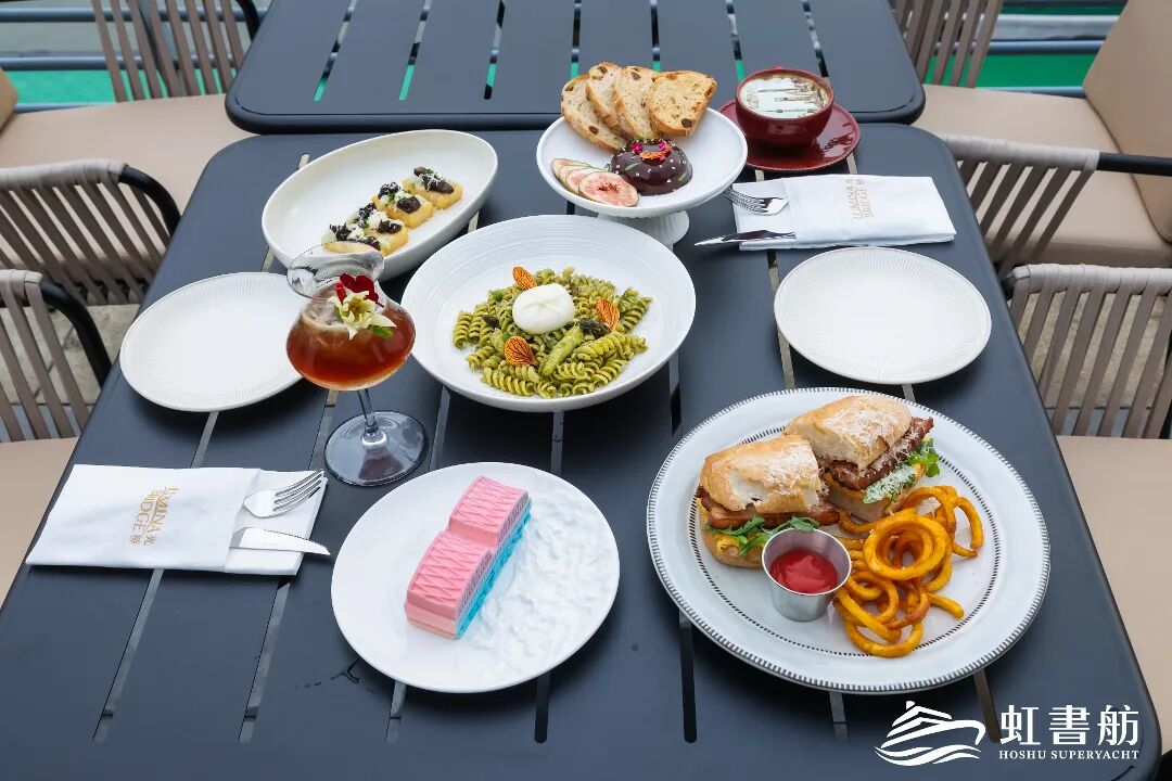 甲板旁的LUMINA光桥,是苏州河畔新晋的日咖夜酒文化打卡地,融合了中法餐饮特色。外白渡桥造型的文创蛋糕、法式焦糖布蕾船等甜品紧扣文创与邮轮主题,还有精心研发的十款名人拿铁,随赠文学卡片,让文化元素融入每一个消费细节。