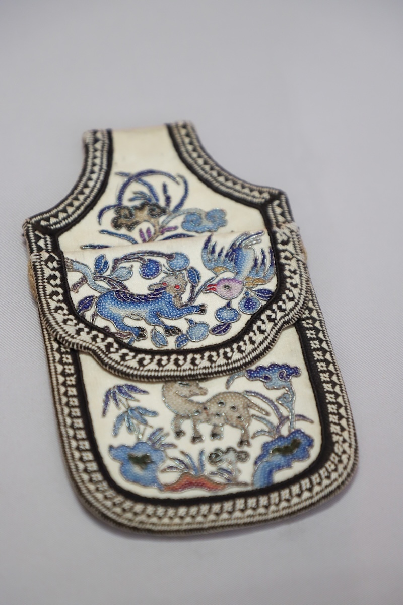 白缎地三蓝打籽绣盘银瑞兽珍禽纹单面钱荷包,时代:清中晚期,地域、流派:浙江