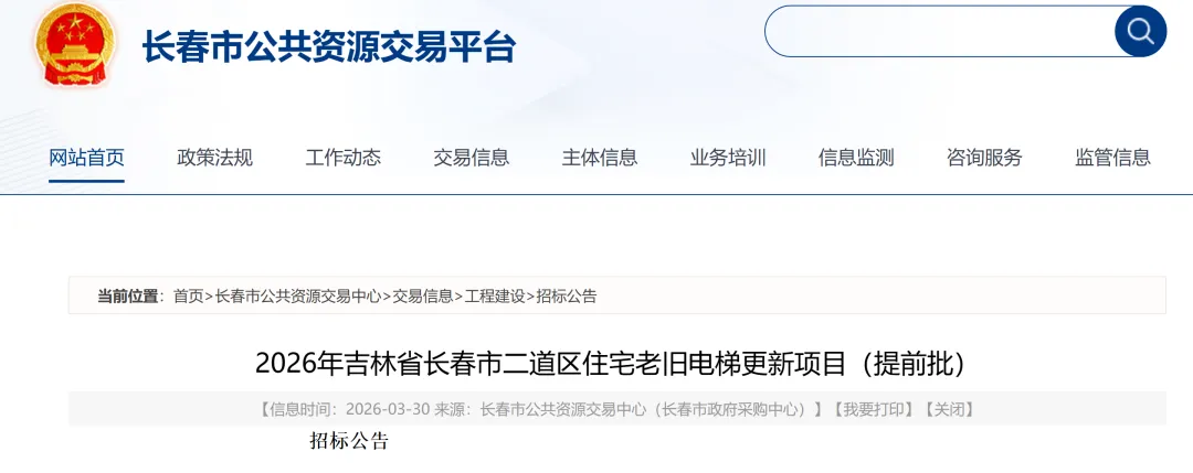 近日,长春市公共资源交易平台发布了《2026年吉林省长春市二道区住宅老旧电梯更新项目(提前批)》的招标公告,以下是该公告的重点内容:
