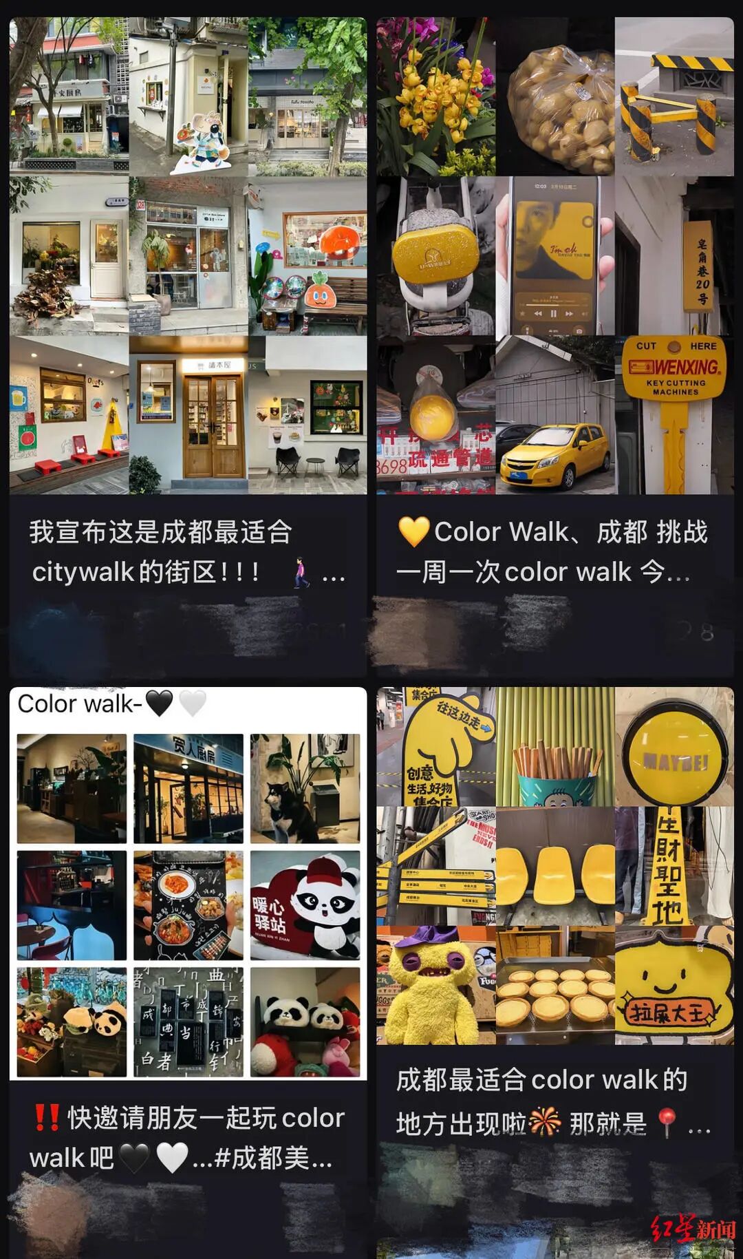 她没意识到,最近成都有数千年轻人都在做类似的事——选一种颜色,走上街头,记录所有与之相关的事物。这种被称为“colorwalk(色彩漫步)”的玩法,成了今年春天最火的出游方式。