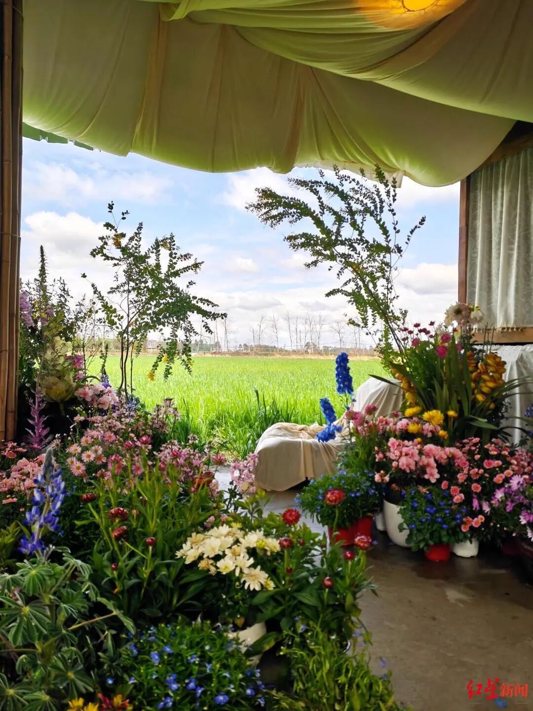 新都区军屯镇,千亩油菜花海里支起帐篷,花田火锅在花丛中沸腾。“赏花季生意太好了,中午就没停过。”火锅店老板说,周末一天接待20多桌客人,营业额破万元,是平时的3倍多。家常菜馆老板也坦言:“周末来看油菜花的人,基本会在这儿吃饭、买特产,有的还会住一晚。”