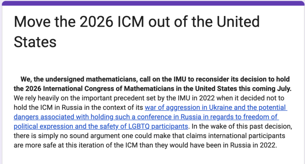 数学家们表示:“若ICM旨在促进国际团结,IMU执意在美国举办将背离使命。”哥伦比亚大学教授Michael Harris指出,ICM因俄乌冲突取消俄罗斯举办权,却在美国发动两场非法战争后仍如期举办,是双重标准。