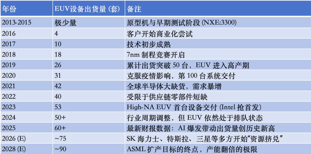 当前ASML每年EUV出货50-60台,2028年有望提升至约90台,但仍难满足需求。