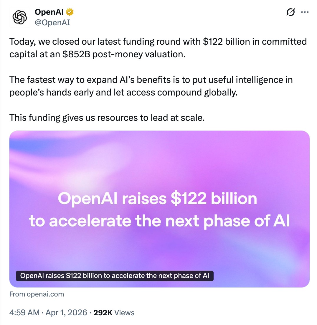 智东西4月1日消息,今日早间,OpenAI对外公布完成最新一轮融资,此次募集资金高达1220亿美元(约合人民币8416.78亿元),投后估值攀升至8520亿美元(约合人民币58779.48亿元),一举成为全球私募股权领域史上规模最大的单笔融资。