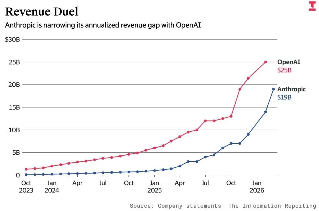 OpenAI的收入仍高于竞争对手Anthropic,但两者差距正在缩小——Anthropic的年化收入近期突破190亿美元(约合人民币1310亿元)。