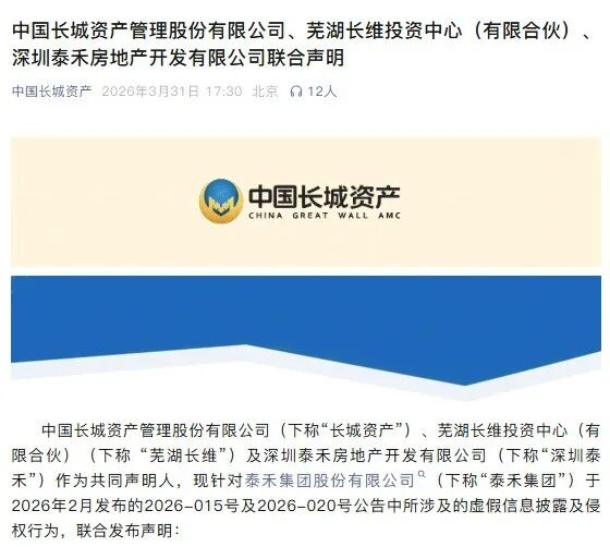 3月31日,长城资产、芜湖长维投资中心(有限合伙)、深圳泰禾房地产开发有限公司三方联合发布严正声明,明确指出泰禾集团2026年2月发布的2026-015号及2026-020号公告存在虚假信息披露与恶意侵权问题。声明内容清晰明确,无任何模糊表述。