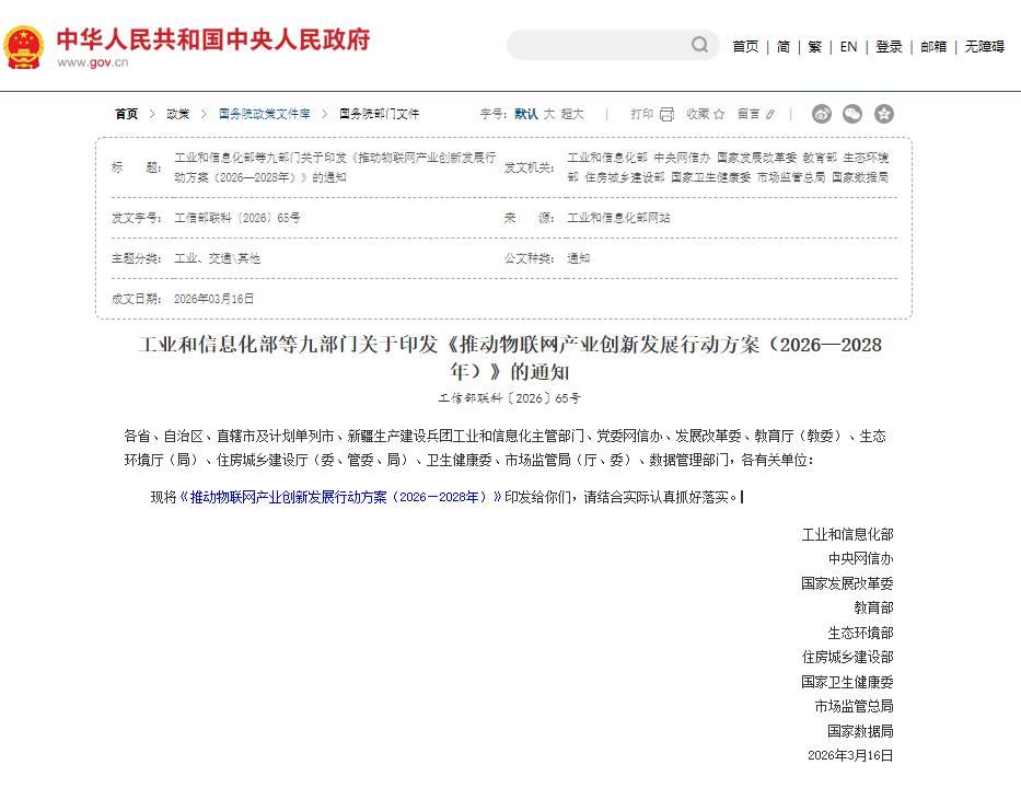 3月31日,工信部等九部门联合印发《推动物联网产业创新发展行动方案(2026—2028年)》。文件提出量化目标:到2028年,物联网终端连接数力争达百亿级,核心产业规模突破3.5万亿元。