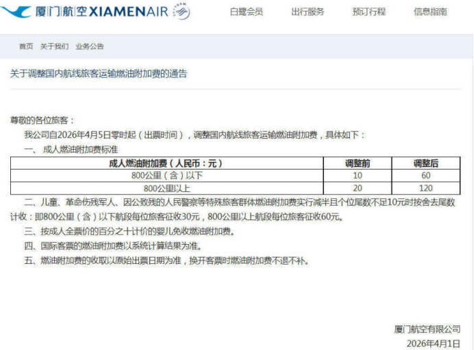 但仅仅一天后的4月1日,厦门航空、中国联合航空等航空公司正式发布通告,确认了此前的涨价标准。