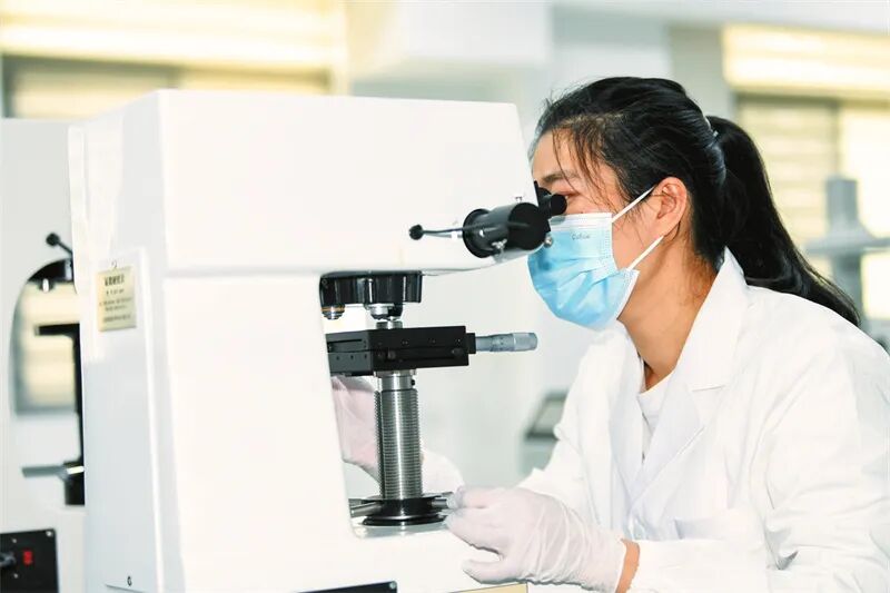 在海南苏生生物科技有限公司生物综合实验室内,工作人员正在进行产品硬度测量。记者 康登淋 摄