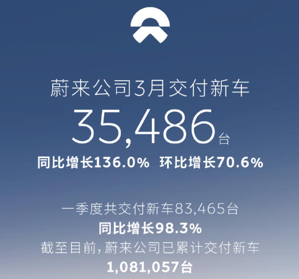 蔚来集团3月交付3.55万台,同比增长136%、环比增长71%。其中蔚来品牌交付2.25万台,同比增长120%、环比增长48%;销量增长主要得益于全新ES8热销——其累计交付达8万台(历时181天),连续三个月蝉联大型SUV销量冠军。