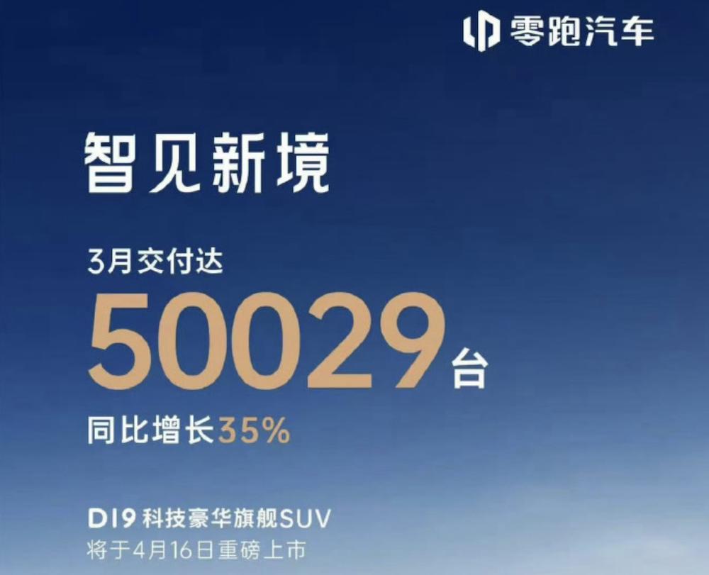 零跑汽车3月交付5.00万台,同比增长35%、环比增长78%(较2月的2.81万台增加超2万台),销量增长主要依托现有车型的持续增量。