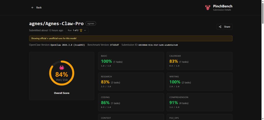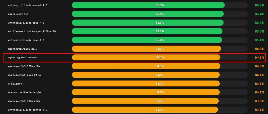 根据全球权威「养虾」AI评测榜单PinchBench,Agnes-1.5-Pro模型在准确性维度表现突出,已跻身榜单前列,成为开发者「最佳养虾模型」选择之一。