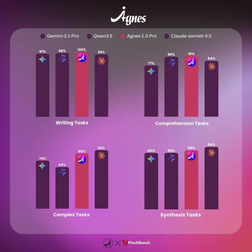 PinchBench榜单中Agnes-1.5系列模型在准确性维度表现突出